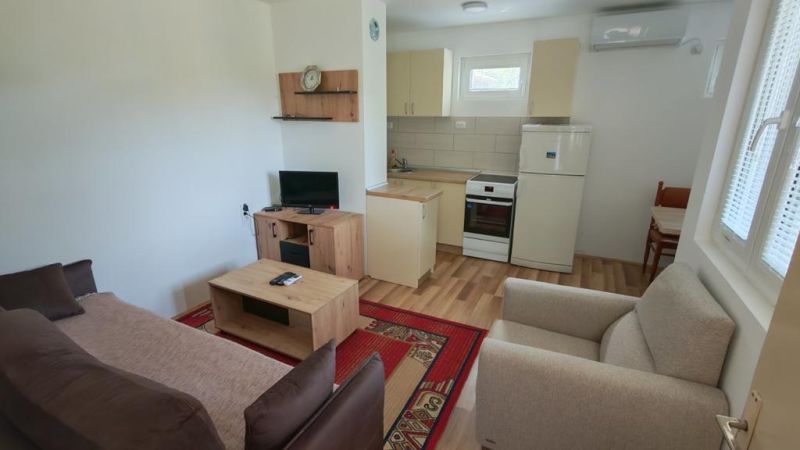 Kuća za izdavanje se sastoji od dnevne sobe sa trpezarijom, kuhinjom sa pratećim elementima i trosedom na razvlačenje. Spavaća soba ima francuski ležaj, krevet samac i krevetac za decu. Kuća ima